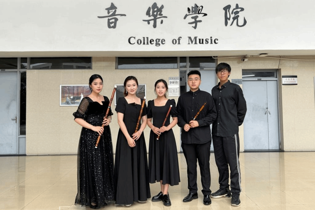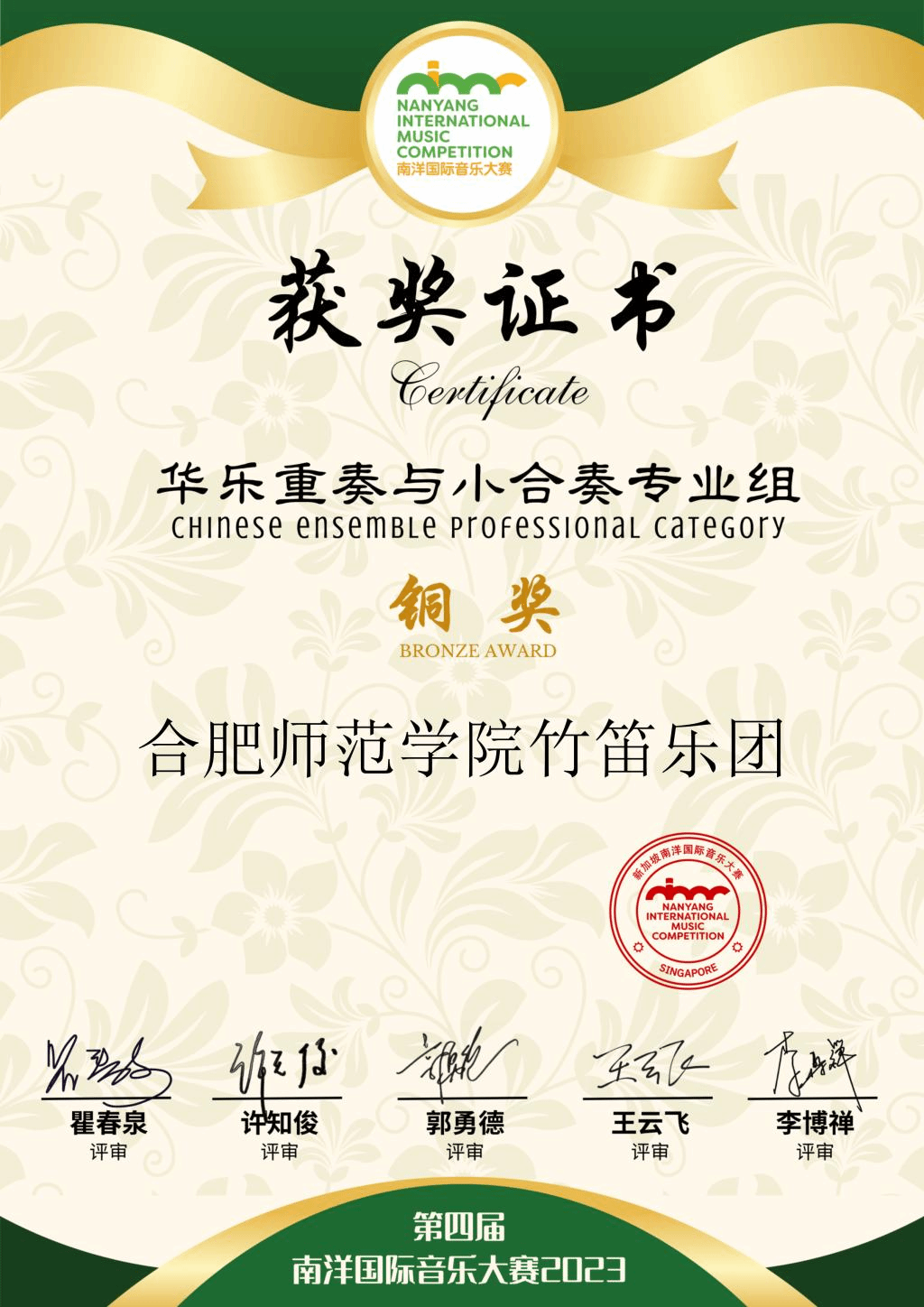 本网讯 由新加坡南洋艺术学院主办的第四届南洋国际音乐大赛(华乐组)于7月25日圆满落幕。威廉希尔足球2020级4位竹笛主项学生郑伟康、高佳佳、赵晓雨、王子妍,2022级打击乐主项学生侯仰骐组成的“威廉希尔williamhill竹笛乐团”在马雪老师的指导下参加了华乐重奏与小合奏专业组比赛,斩获铜奖。