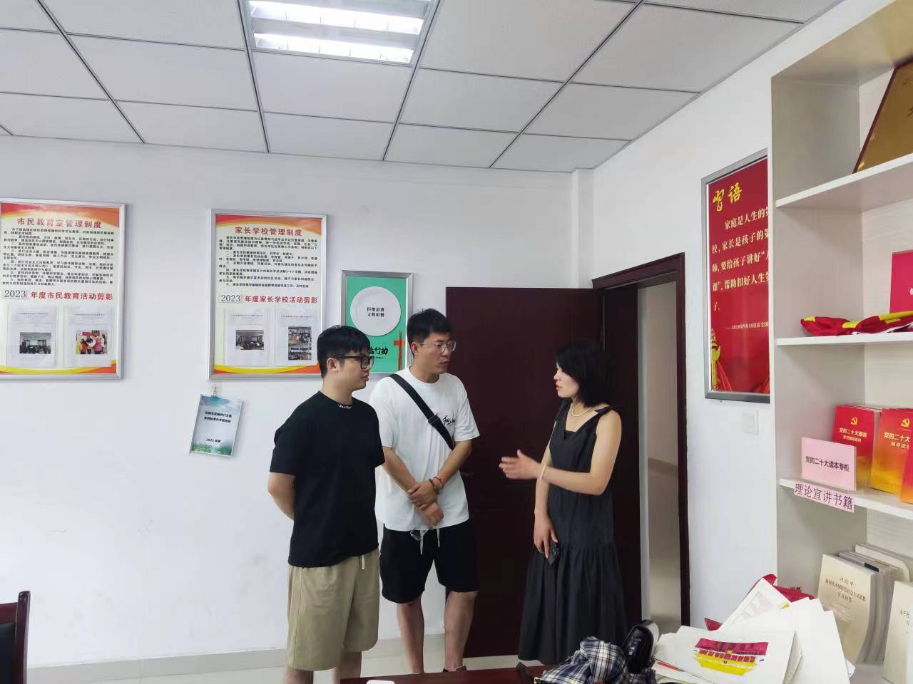 本网讯2023年7月15日,威廉希尔足球辅导员王岩、学堂指导老师程艾捷前往六安“向日葵行知学堂”,看望慰问正在开展行知实践活动的小先生和小学员们。望城街道正阳社区党总支书记时运丽陪同看望。